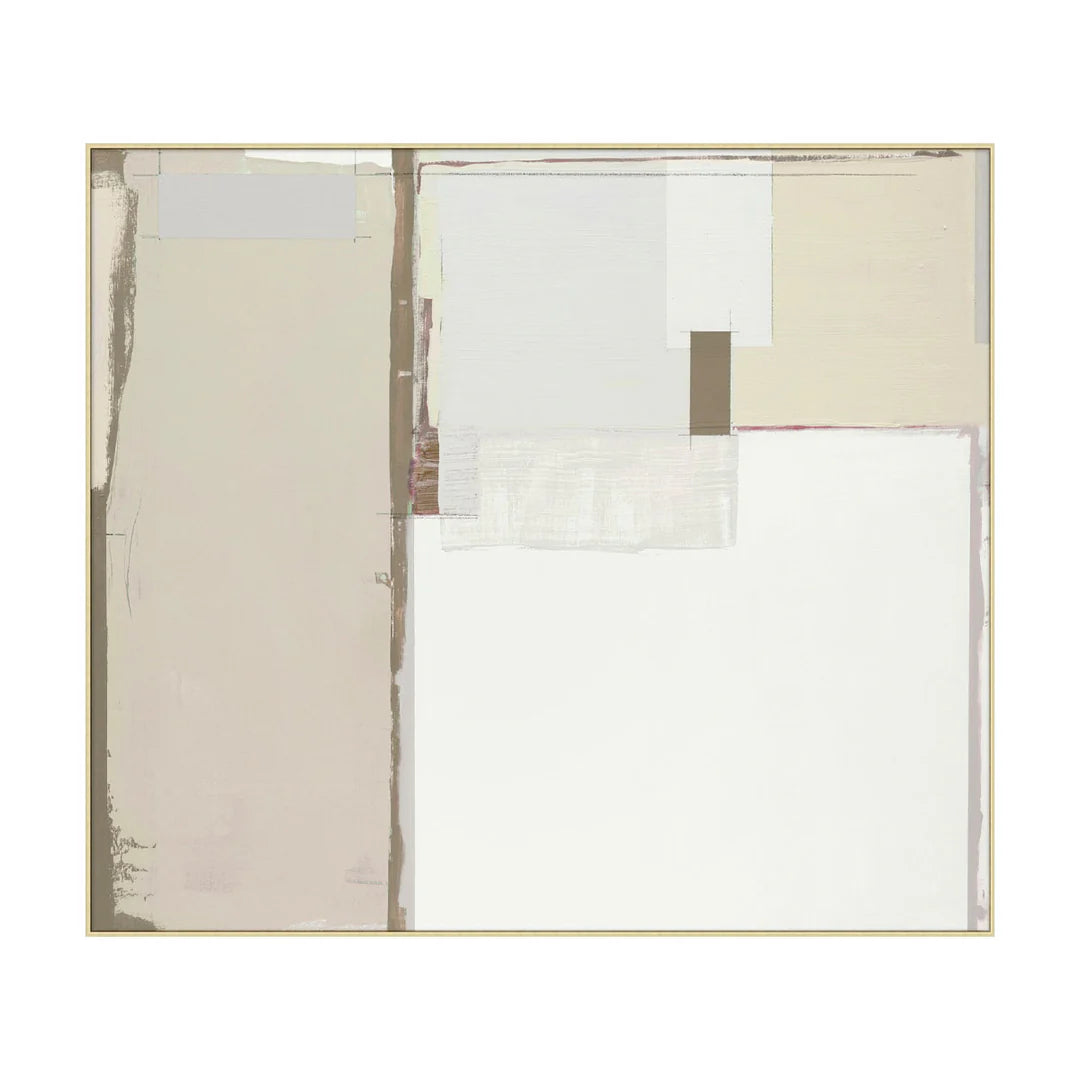 柔らかなベージュとホワイトのレイヤーが重なり合い、穏やかな空気を纏った抽象アートです。水平と垂直の構成がシンプルでありながら奥行きを感じさせ、余白の美しさと洗練されたバランスが際立ちます。淡く上品な色彩は空間に自然と溶け込み、モダン、北欧、ミニマルなど幅広いインテリアに調和します。まるで静かな光に包まれた空を切り取ったような一枚です。
