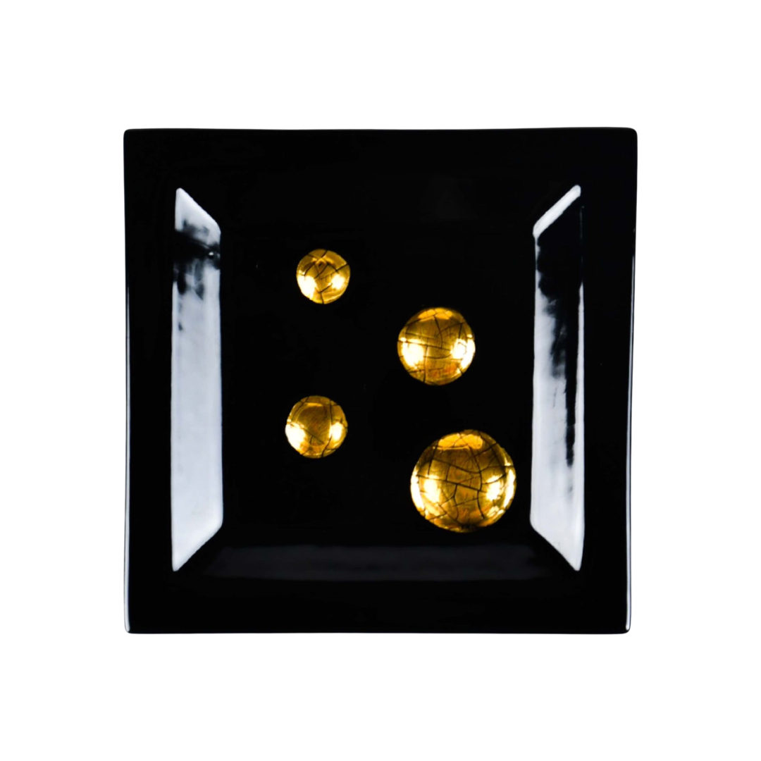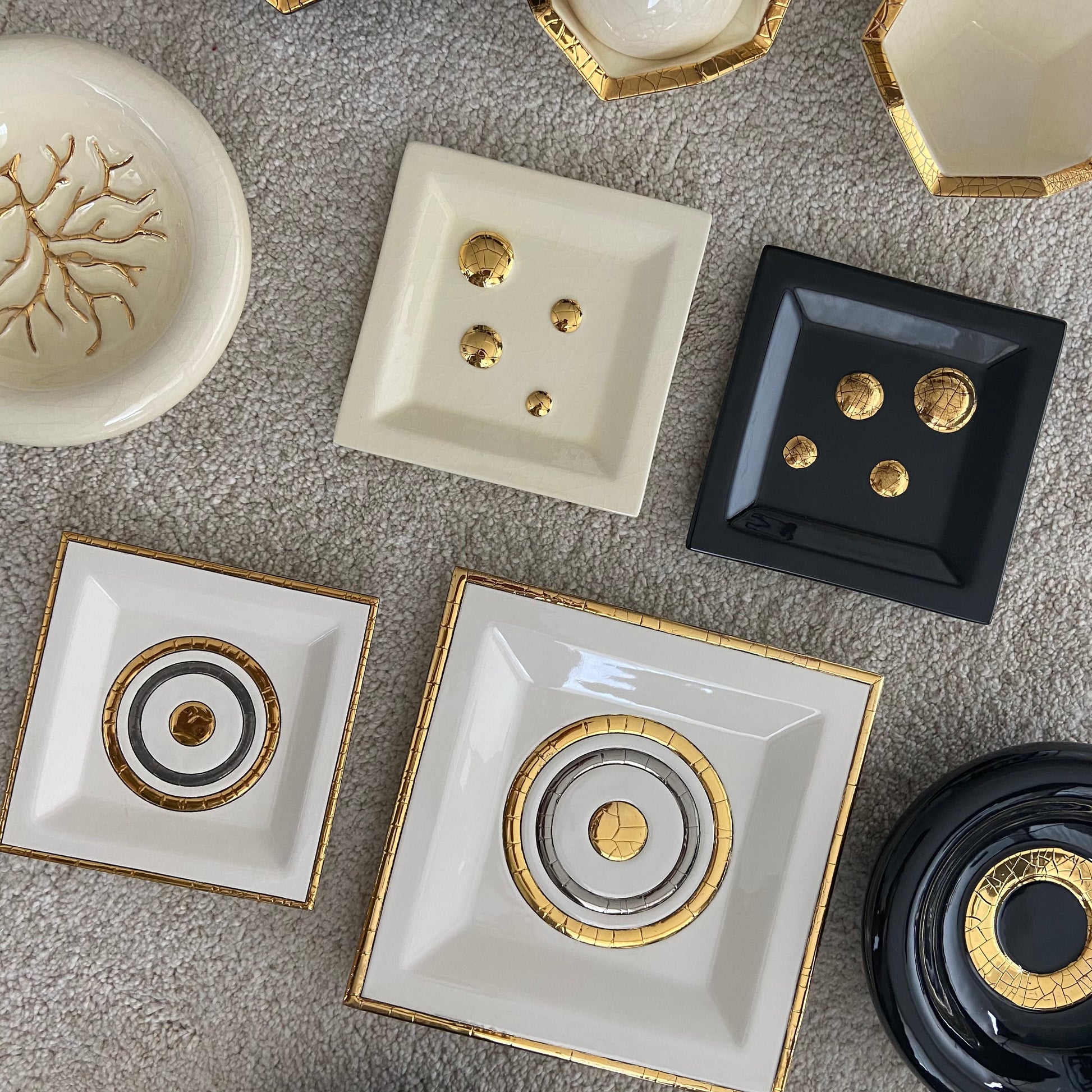 エモー・ドゥ・ロンウィのトレイは、卓上の装飾はもちろん、裏面に穴が設けられているため、壁面の飾り付けとしても気軽にお愉しみ頂けます。ロンウィの陶器の表面には、美しく輝くプラチナや金が贅沢に塗り込まれています。純金を原料とした「金液」を用いて施される金彩装飾は、ラグジュアリーブランドであるロンウィの象徴です。