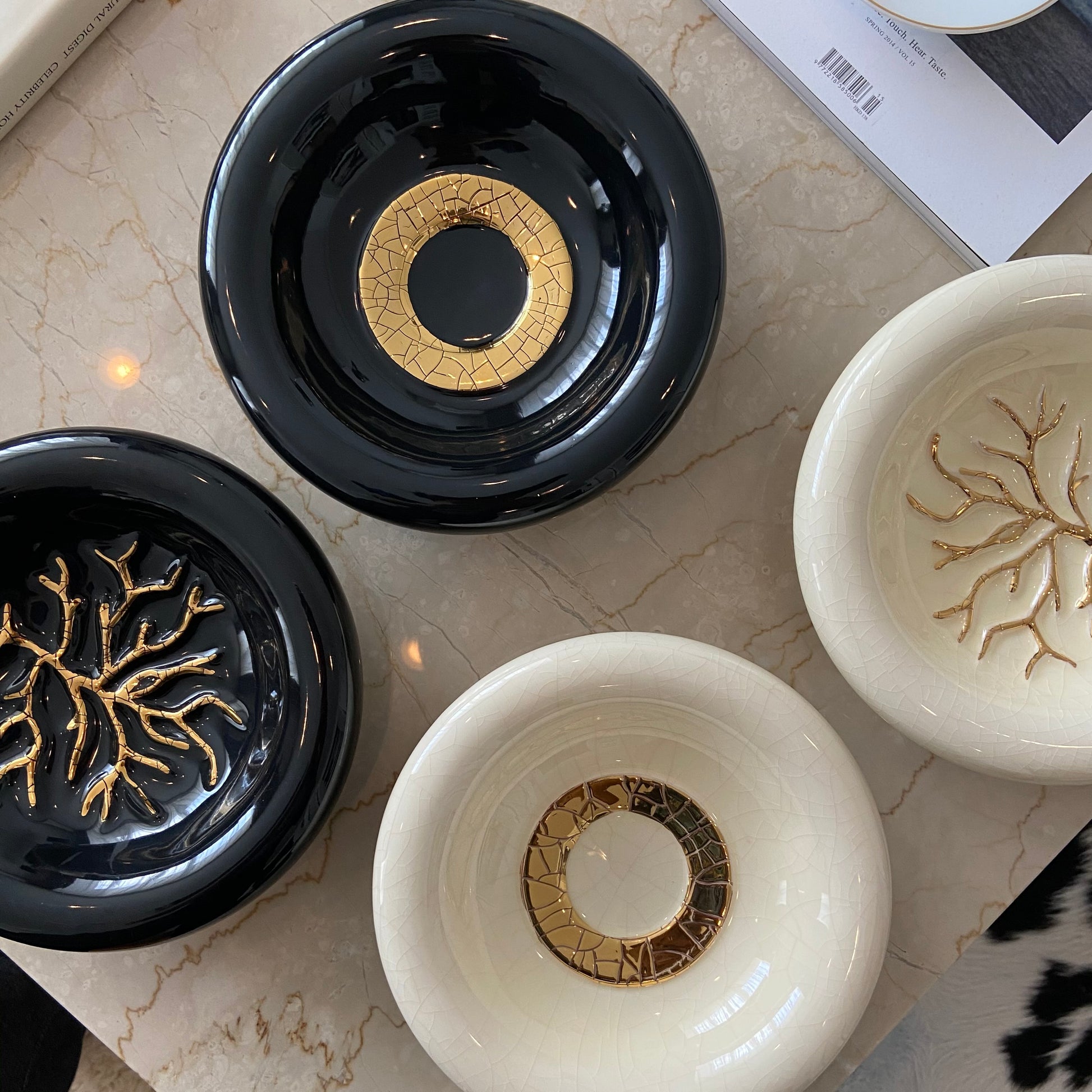 フランス北東の街・ロンウィの工房で丁寧にハンドメイドされたラウンドトレイ。コーヒーテーブルやコンソールテーブルのデコレーションに適したサイズのこのアイテムは、「部屋を飾る愉しさ」をそっと貴方に教えてくれいます。純金を原料とした「金液」を用いて施される金彩装飾は、ラグジュアリーブランドであるロンウィの象徴です。