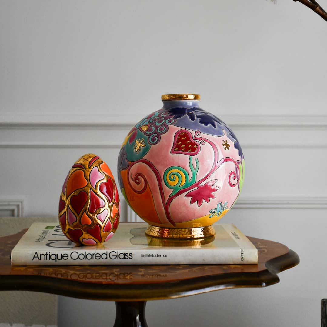 220年受け継がれるエモー・ドゥ・ロンウィ特有のエナメル装飾技法によって生み出されたセラミックアート。緻密な柄と発色の良さは、他の陶器メーカーとは一味違うインパクトをインテリアに与えてくれます。凹凸のある表面からは、ハンドメイドならではの温かみが感じられ、美術品と共に暮らす豊かさを教えてくれます。