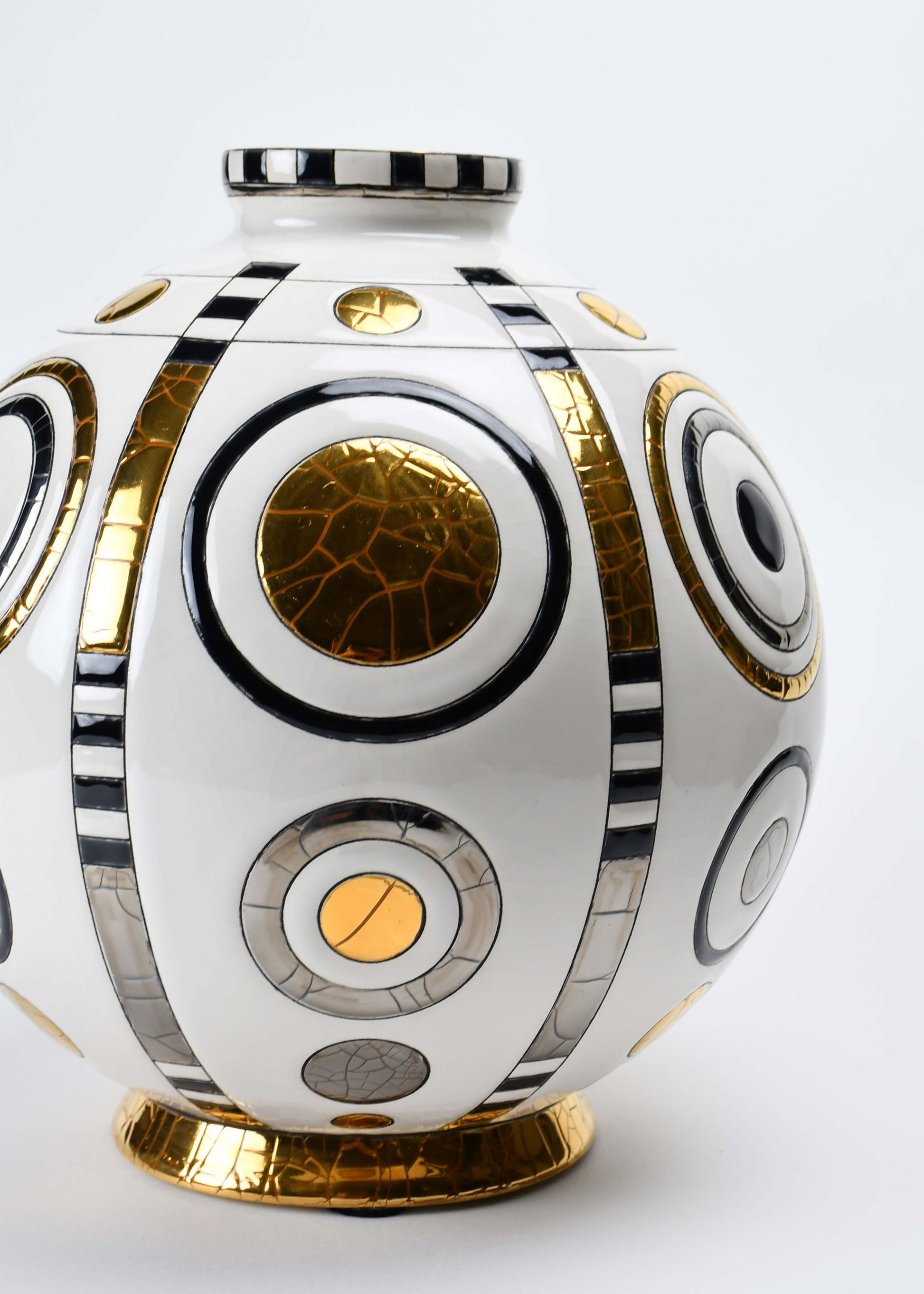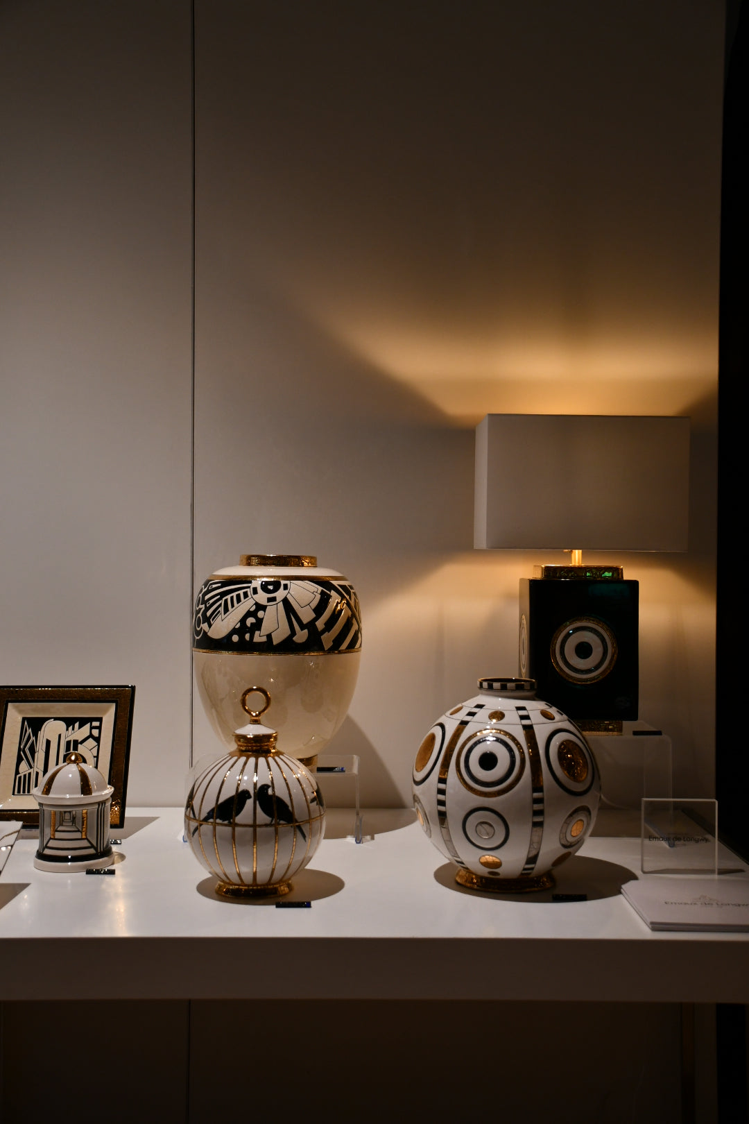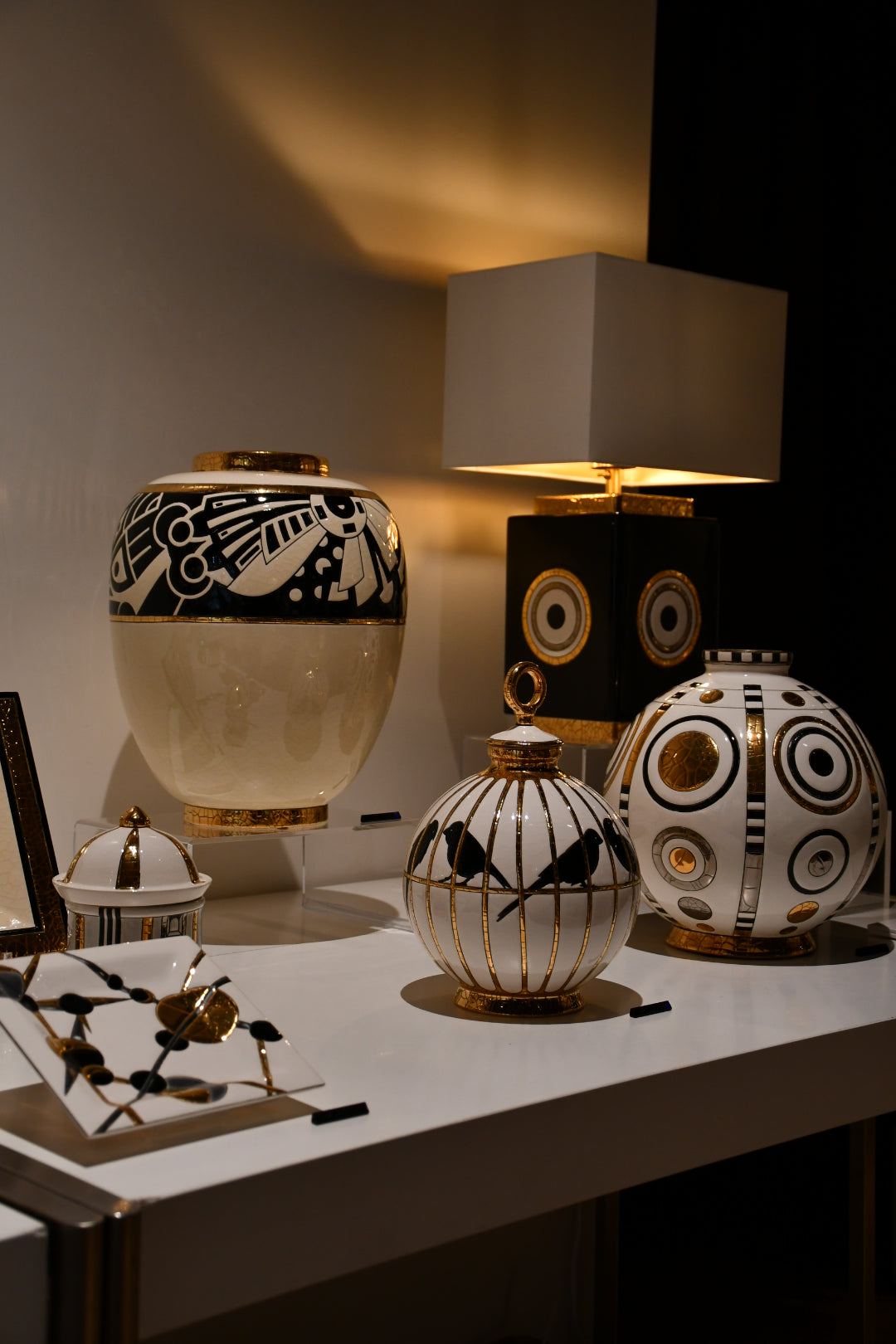 熟練の職人技が要される約200にも及ぶ作業工程を経て、フランス最高峰のエナメル陶器は完成します。工房では伝統技法を継承した職人が、成形、絵付け、焼成などの工程を全て手作業で行っており、完成した陶器には、最高品質を保証する証として、ロンウィの紋章が印字されます。ロンウィの陶器の表面には、美しく輝くプラチナと金が贅沢に塗り込まれています。純金を原料とした「金液」を用いて施される金彩装飾は、ラグジュアリーブランドであるロンウィの象徴です。