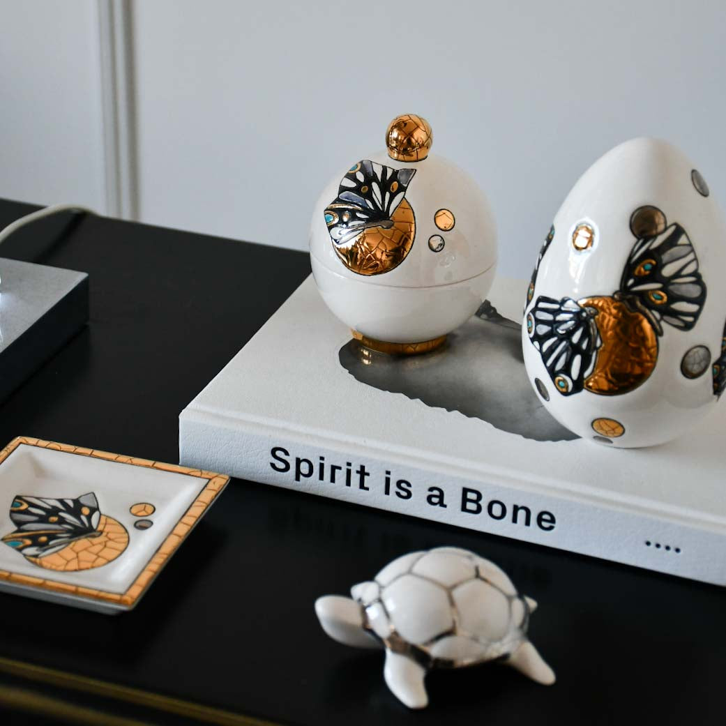 220年受け継がれるエモー・ドゥ・ロンウィ特有のエナメル装飾技法によって生み出されたセラミックアート。緻密な柄と発色の良さは、他の陶器メーカーとは一味違うインパクトをインテリアに与えてくれます。凹凸のある表面からは、ハンドメイドならではの温かみが感じられ、美術品と共に暮らす豊かさを教えてくれます。熟練の職人技が要される約200にも及ぶ作業工程を経て、フランス最高峰のエナメル陶器は完成します。工房では伝統技法を継承した職人が、成形、絵付け、焼成などの工程を全て手作業で行っており、完成した陶器には、最高品質を保証する証として、ロンウィの紋章が印字されます。ロンウィの陶器の表面には、美しく輝くプラチナや金が贅沢に塗り込まれています。純金を原料とした「金液」を用いて施される金彩装飾は、ラグジュアリーブランドであるロンウィの象徴です。