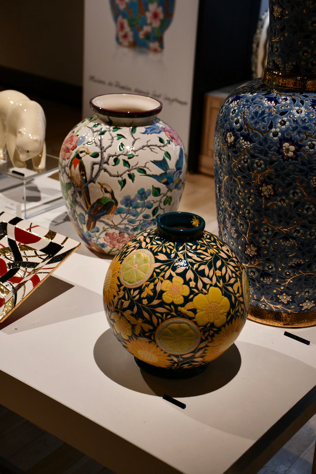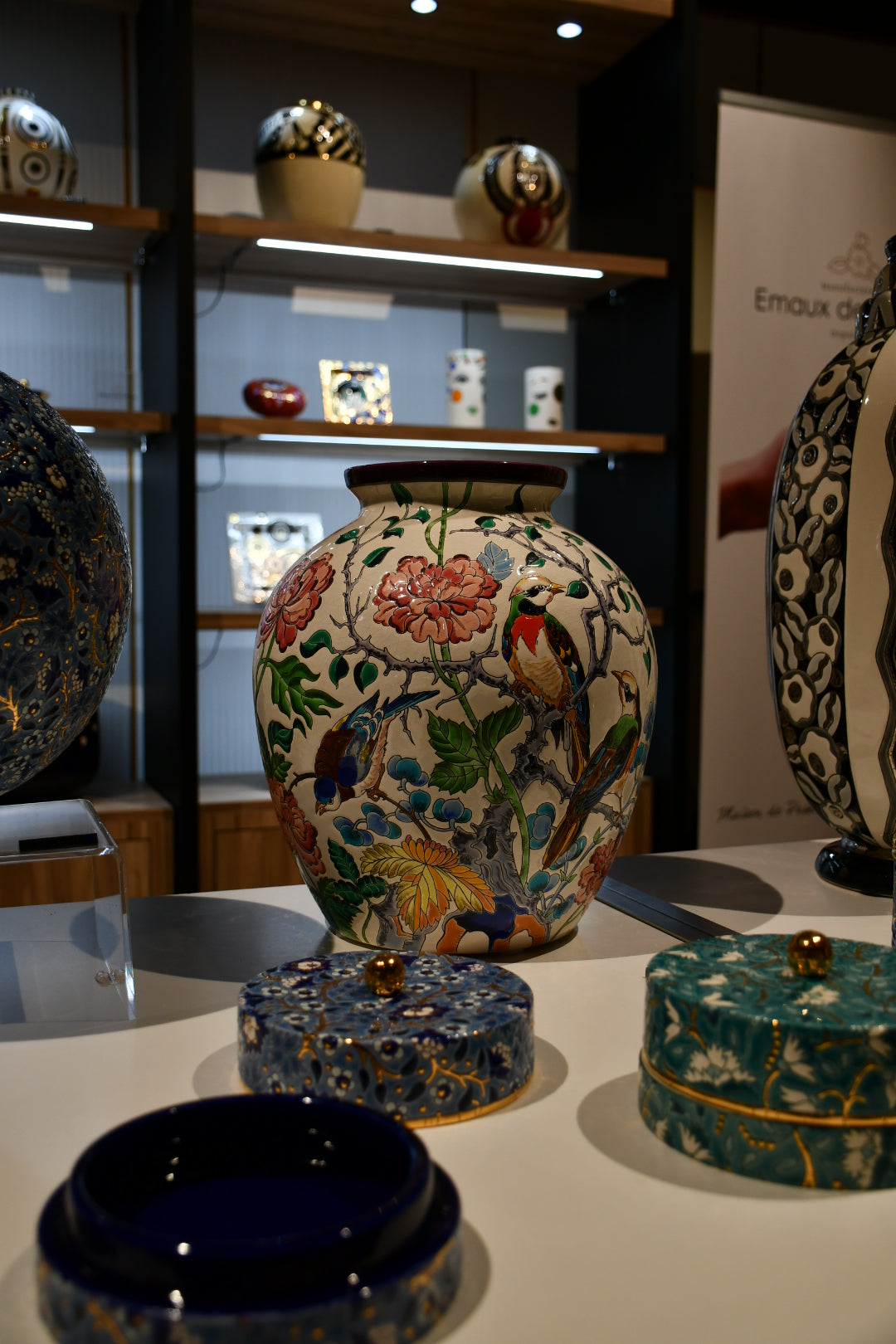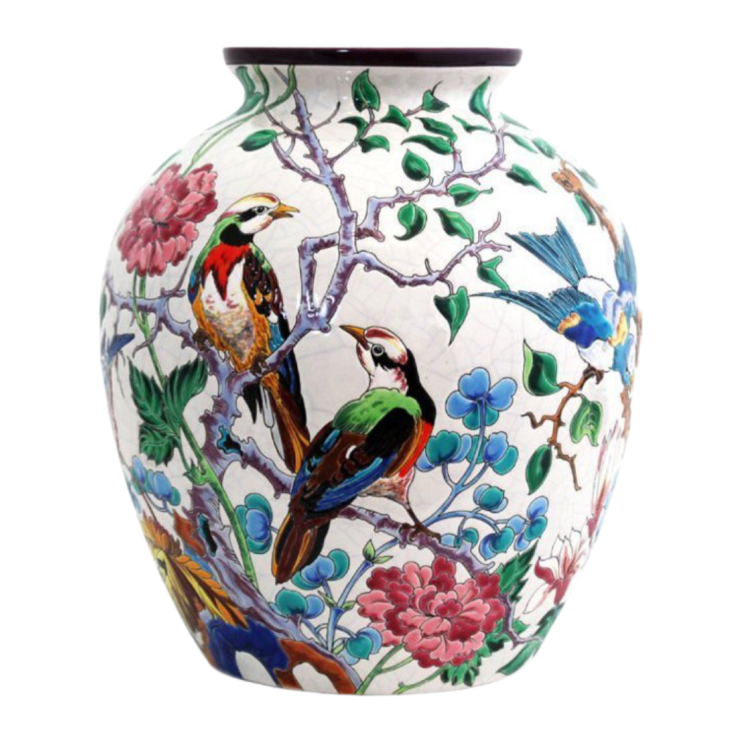 1798年創業のフランスの名窯「エモー・ドゥ・ロンウィ」による「Quietude(キエチュード)」と名付けられたデコレーションヴェースです。この作品はロンウィを代表する伝統柄の一つであり、明るい色遊びで描かれた草花と、今にも飛び立ちそうな臨場感溢れる鳥をモチーフに描かれた和洋折衷なデザインが魅力です。19世紀〜20世紀初頭にかけてフランス美術に強く影響を与えたとされる日本美術(ジャポニズム)。浮世絵や琳派絵画をヒントに、日本の美意識を積極的にセラミックアートに取り入れたロンウィの作品は、1937年のパリ万博のデザインコンペで金賞を受賞します。220年を超える歴史と伝統がありながらも、モダンインテリアに自然と溶け込む世界最高峰のセラミックアートを是非お愉しみください。