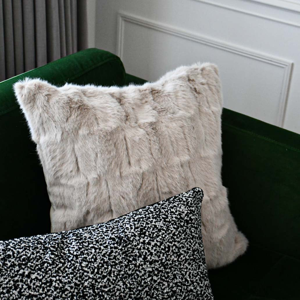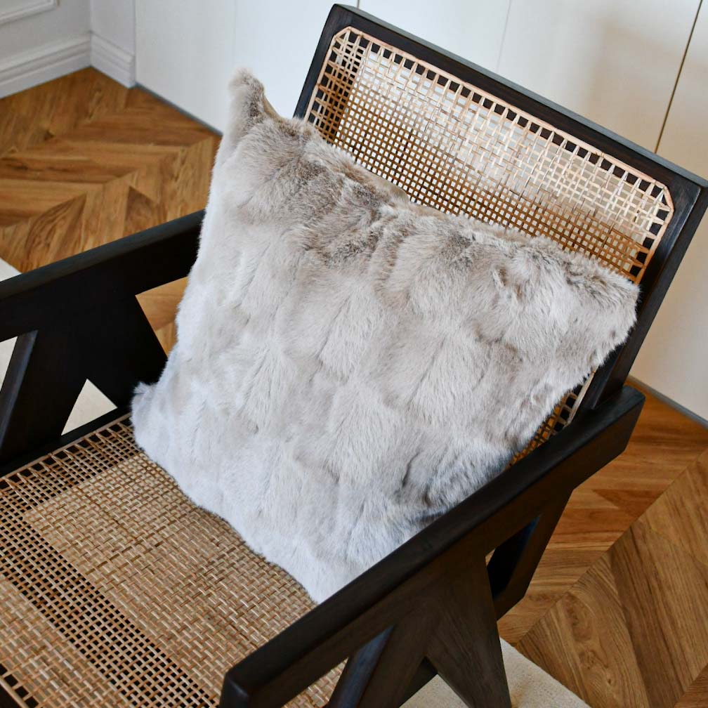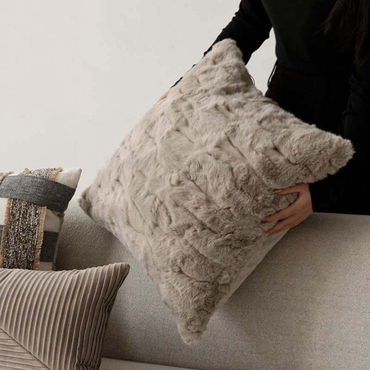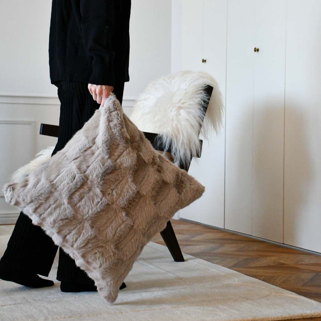 ふわふわとした肌触りの良いフェイクファー生地の50cm角のクッションカバーです。思わず手に取りたくなってしまうフラッフィーな感触とボリュームが、くつろぎの空間にラグジュアリーなアクセントをもたらします。落ち着いたグレージュカラーのフェイクファーが高級感を演出し、インテリア空間にマッチします。通常よりも一回り大きいサイズの50cm角のクッションは、ふっくらとしていて高級感が漂います。TYSENNで扱うクッションカバーは本来の用途としてだけでなく、取り入れるだけで日常が華やかになるデザインをセレクトしています。