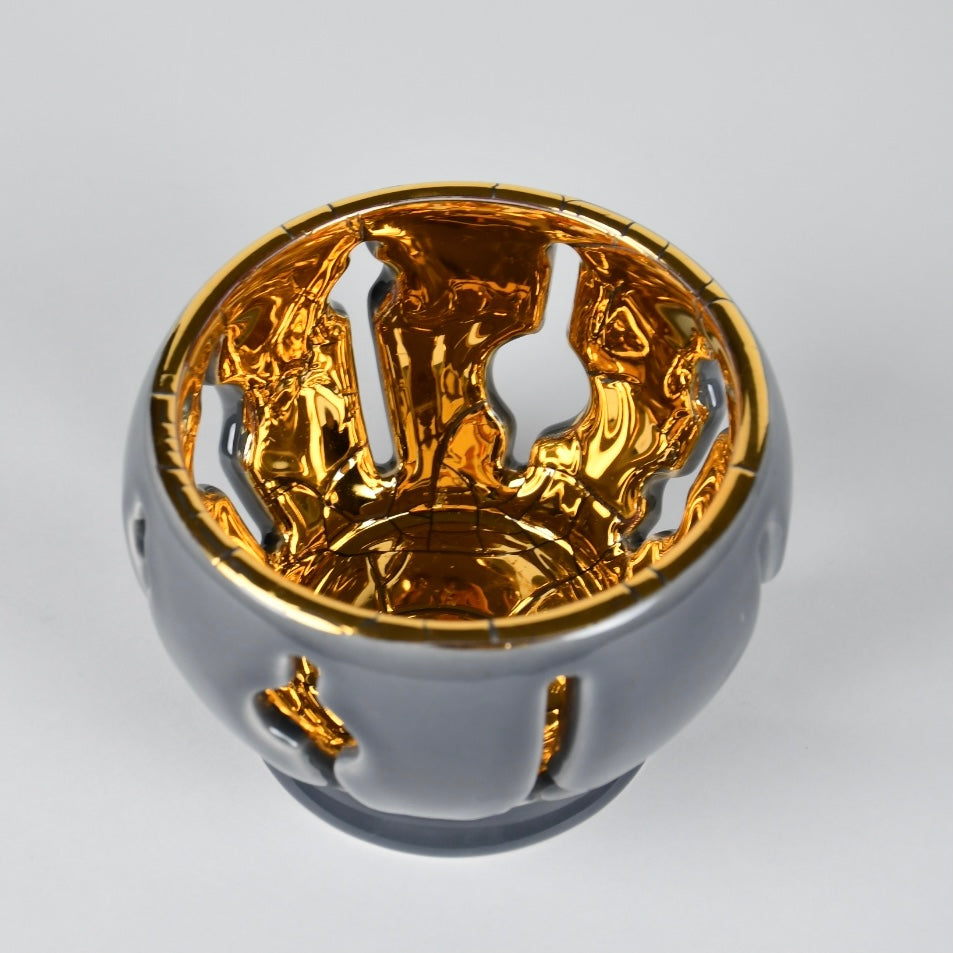 フランスの名窯「エモー・ドゥ・ロンウィ」のエナメル陶器。フランスの熟練職人の手仕事が光る、美しいキャンドルポットです。陶器に施された繊細なカットワークから、内側の鮮やかなゴールドが覗き、上品な輝きを放ちます。光と影のコントラストが美しく、キャンドルの灯りを優しく包み込み、幻想的な雰囲気を演出します。シンプルながらも洗練されたデザインは、どんなインテリアにも調和し、お部屋のアクセントとして存在感を放ちます。特別な日の演出にはもちろん、日常にさりげない贅沢を添えるアイテムとして、長くご愛用いただけます。